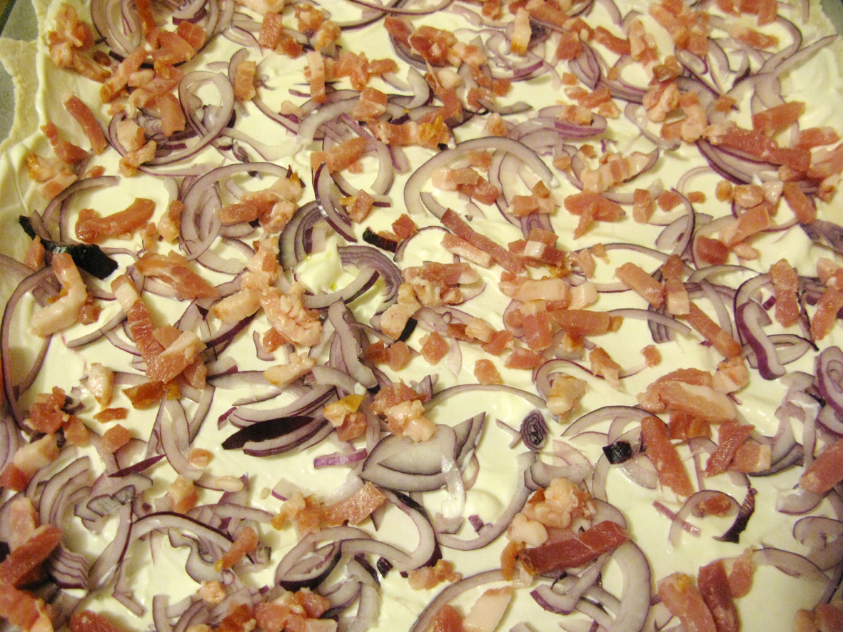 http://en.wikipedia.org/wiki/Tarte_flamb%C3%A9e) si mi-a laudat foarte tare si convingator reteta. Dupa ce m-am gandit la ea mai multe zile aseara am incercat-o si eu si nu am regretat deloc. Are avantajul ca se face foarte repede si alaturi de un vin rosu bun este delicioasa. Dezavantajul este ca se mananca toata tava dintr-o data si ca abia dupa aceea incepi sa te gandesti la silueta :-)